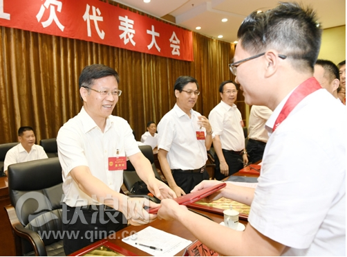 谭丕创(左)为全国五一劳动奖章获奖者颁奖 本报记者 赵冠雄摄